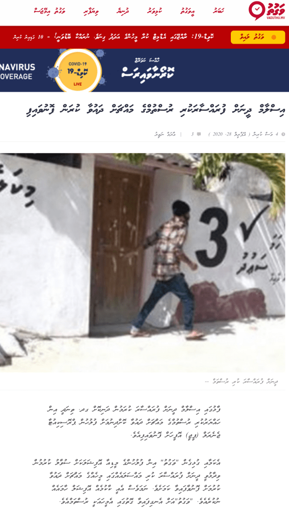 The second article is titled “Islam dheenah furrasaarakuri Rusthumge’ machah dhauvaa kuran fonuvaifi” (The case of Rusthum, who insulted Islam, has been submitted to court for action) and is from 28th April 2020.