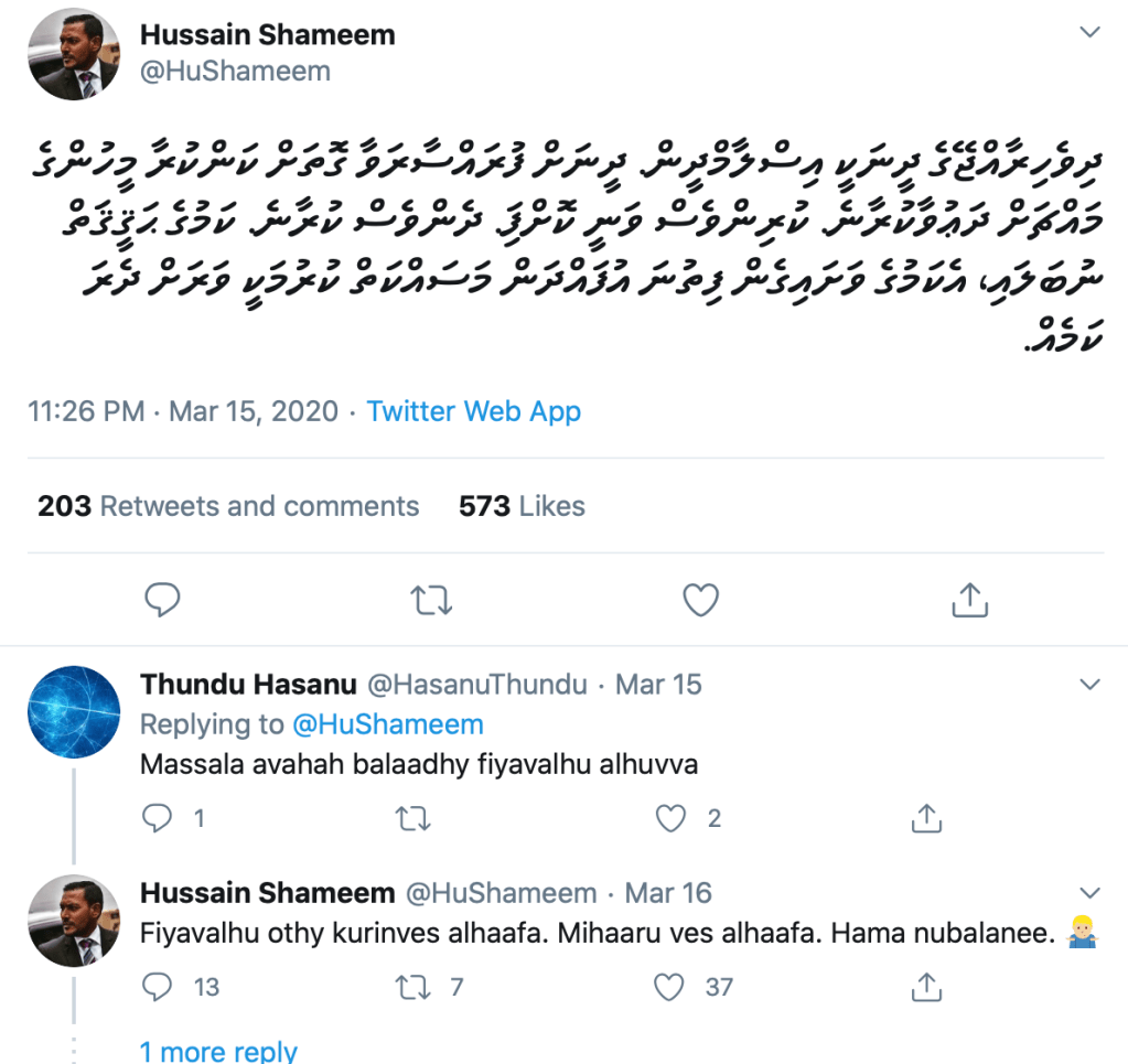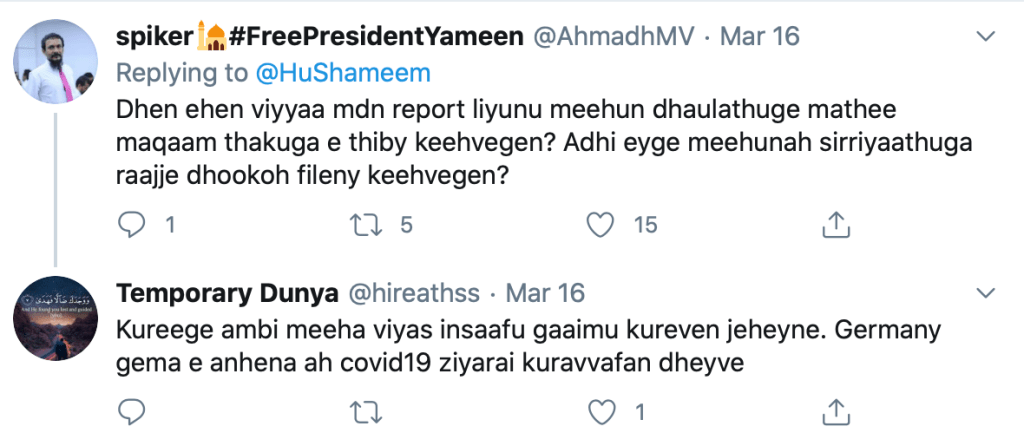 - Anonymous (April 28, 2020) [5 likes] – Shameem is someone who is like Rusthum. People who used to be in MDN (Maldivian Democracy Network) are within this laadheenee government.