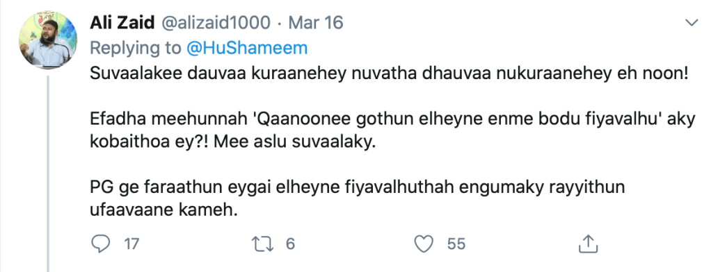 Translation: I call on the PG to follow and fear Allah. Don’t play games with these issues! What action has been taken? He is saying he is not a Muslim. The Maldivian constitution says that only Muslims can be Maldivian citizens. Action has been taken huh?