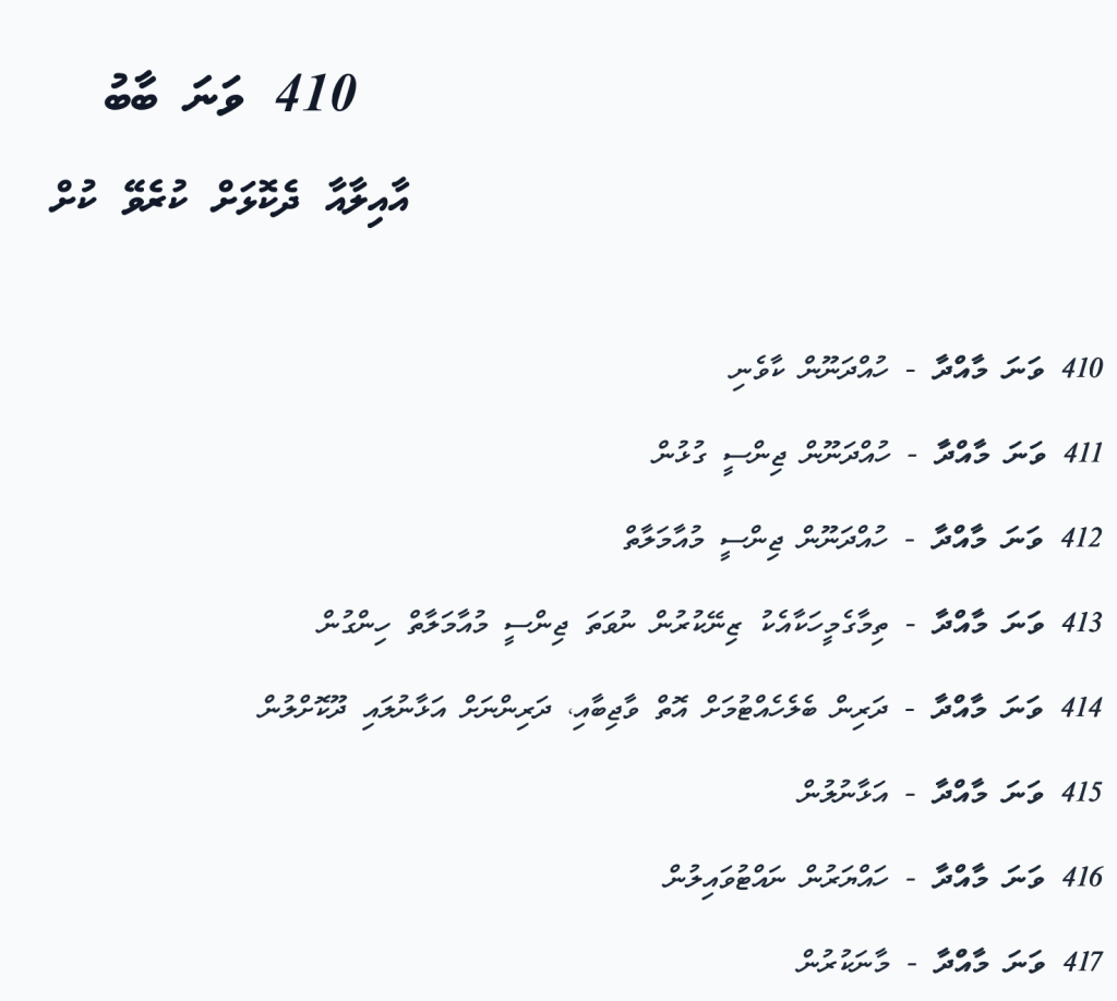 - Section 414 – Child Abandonment and Parental Duty of Care [ދަރިން ބެލެހެއްޓުމަށް އޮތް ވާޖިބާއި، ދަރިންނަށް އަޅާނުލައި ދޫކޮށްލުން][dharin belehettumah oi’ vaajibaai, dharinnah alhaanulai dhookohlun]