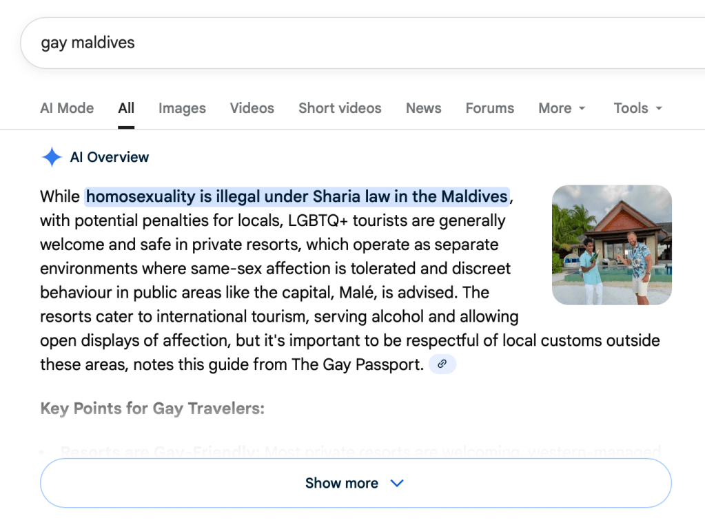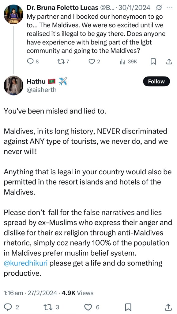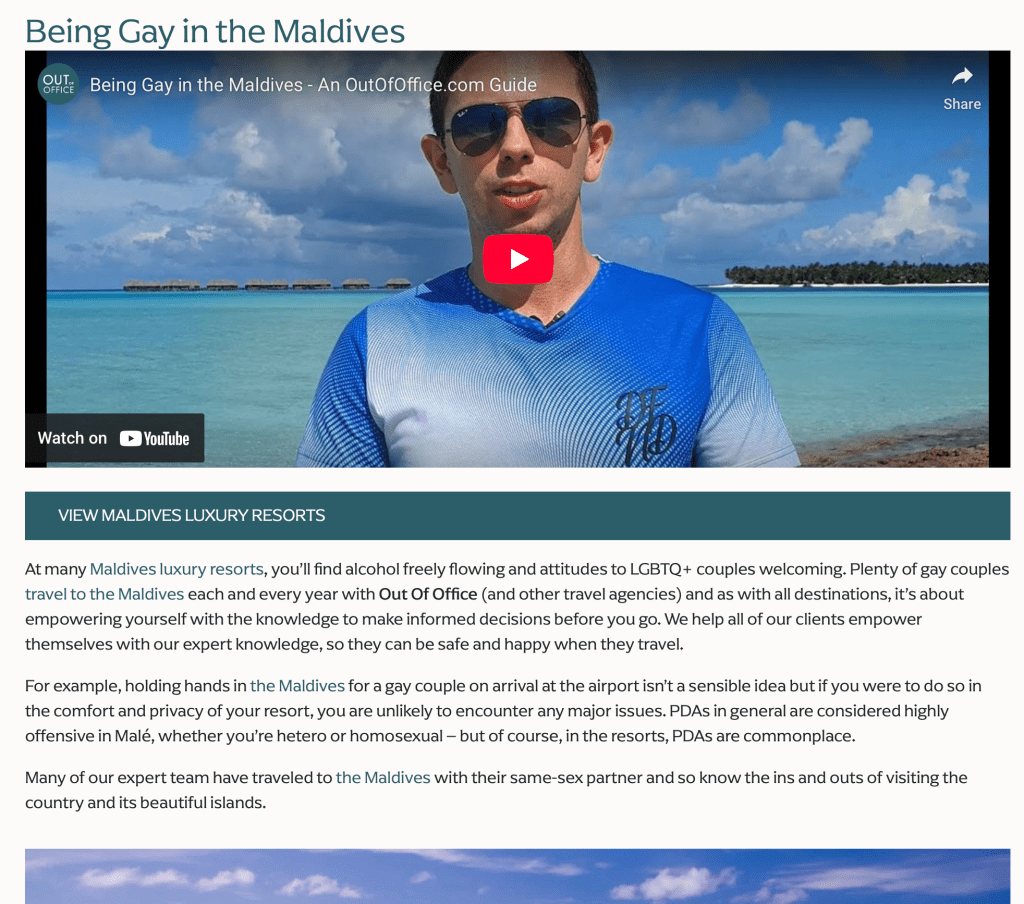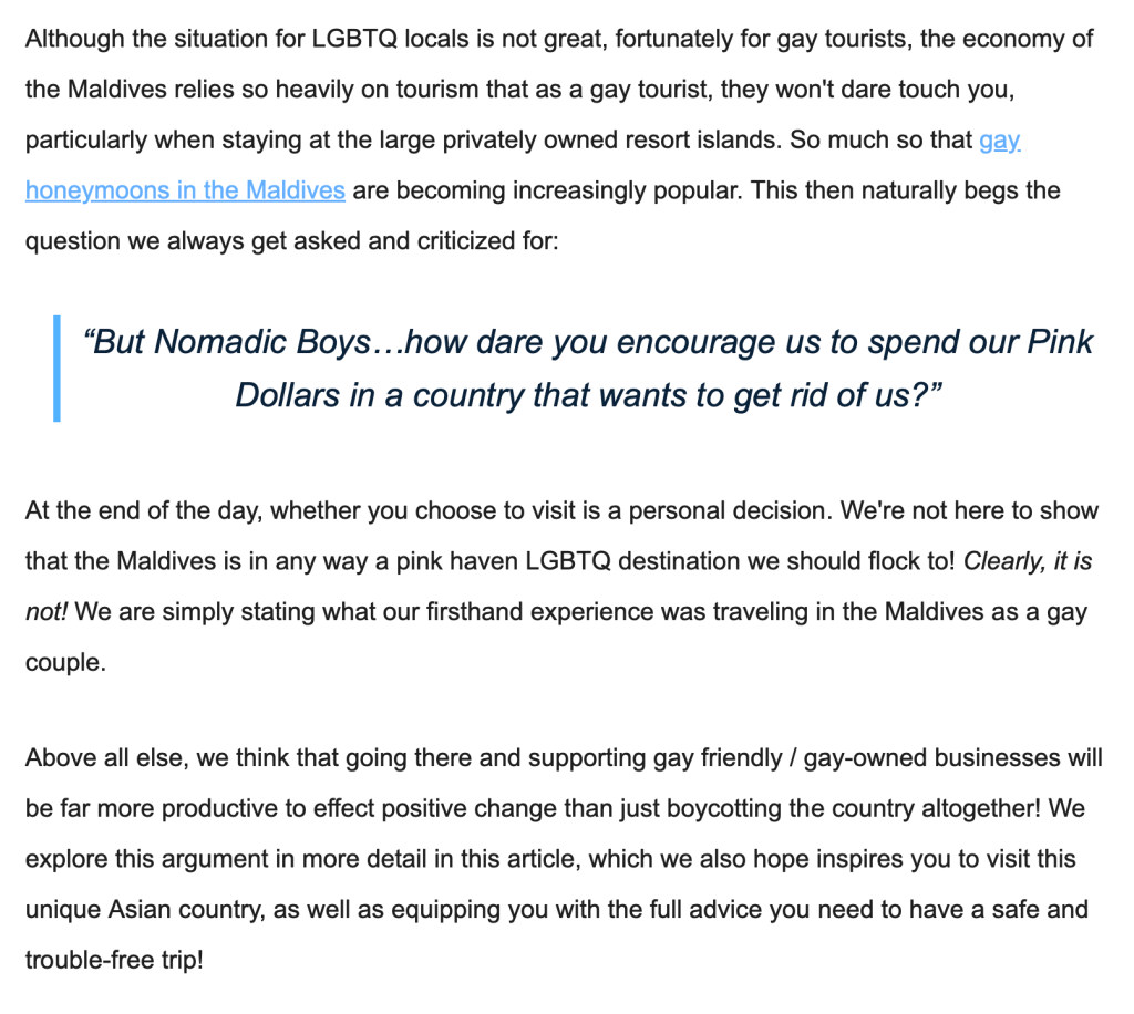Meanwhile, a google search for something like “gay Maldives” will bring up a plethora of articles from queer and gay travel influencers and writers justifying their visit while encouraging others to do the same. They had a great time, why shouldn’t you?