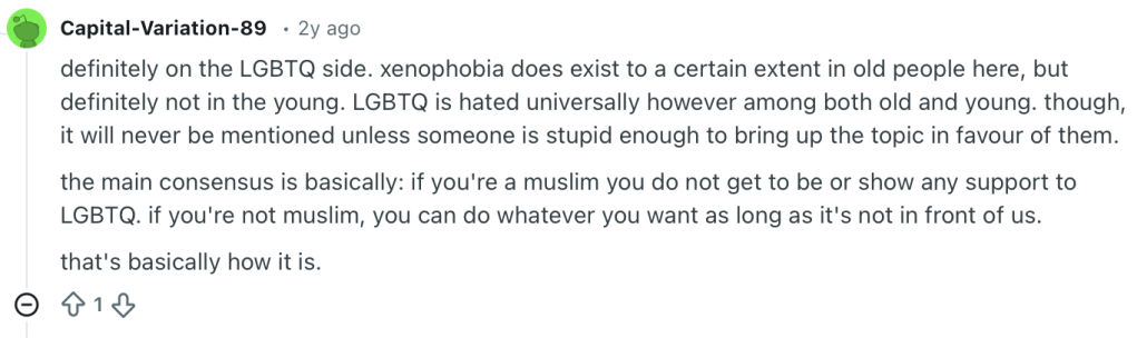 Screenshot from reply to reddit thread “Is it safe for a gay couple to visit Maldives off the resorts?”.