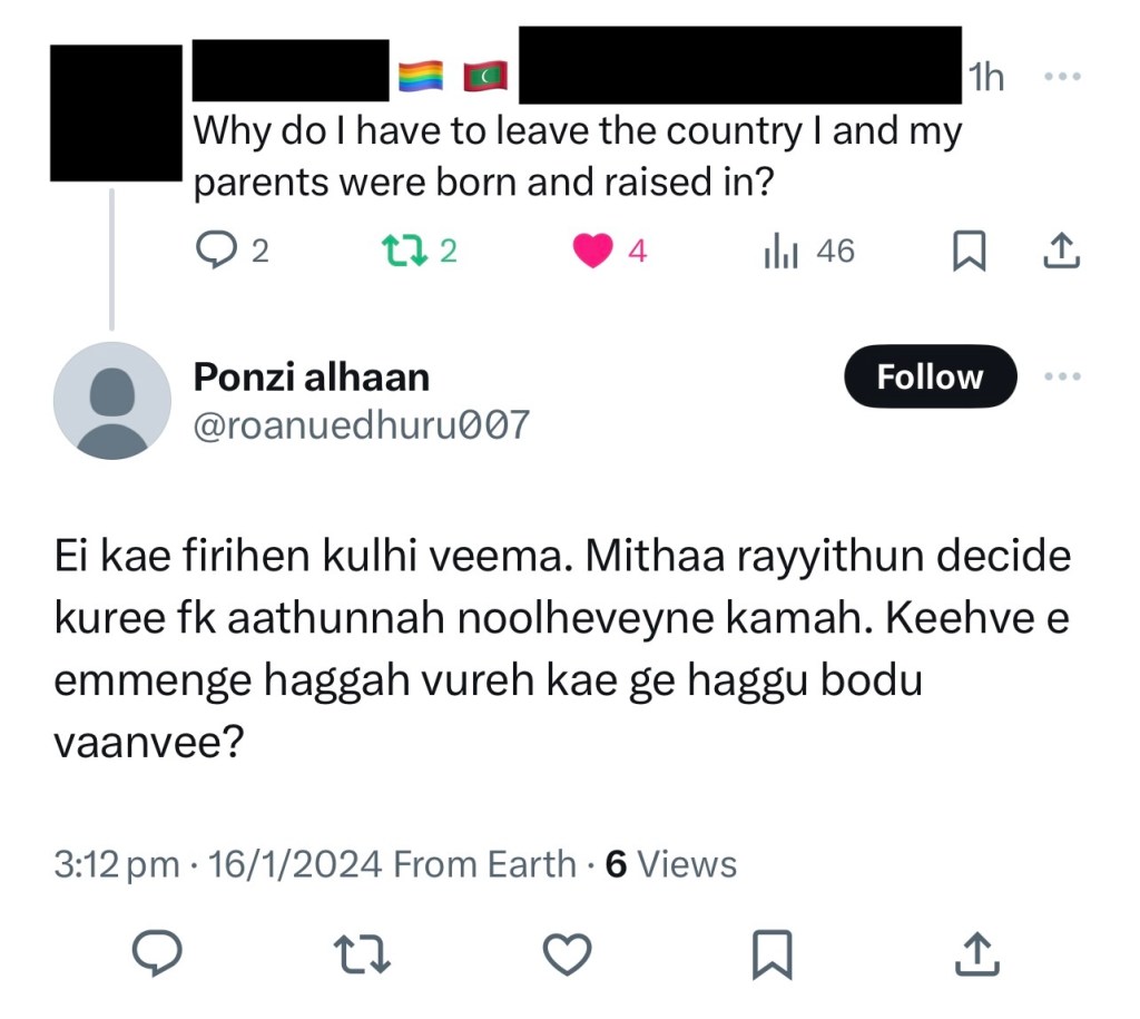 When confronted with the existence of queer Dhivehin, it is common for peaceful Maldivians to react diplomatically with the suggestion to leave. Leave to where your existence is more compatible with the “culture”. Leave before something bad happens. Leave before the violent ones find out.
