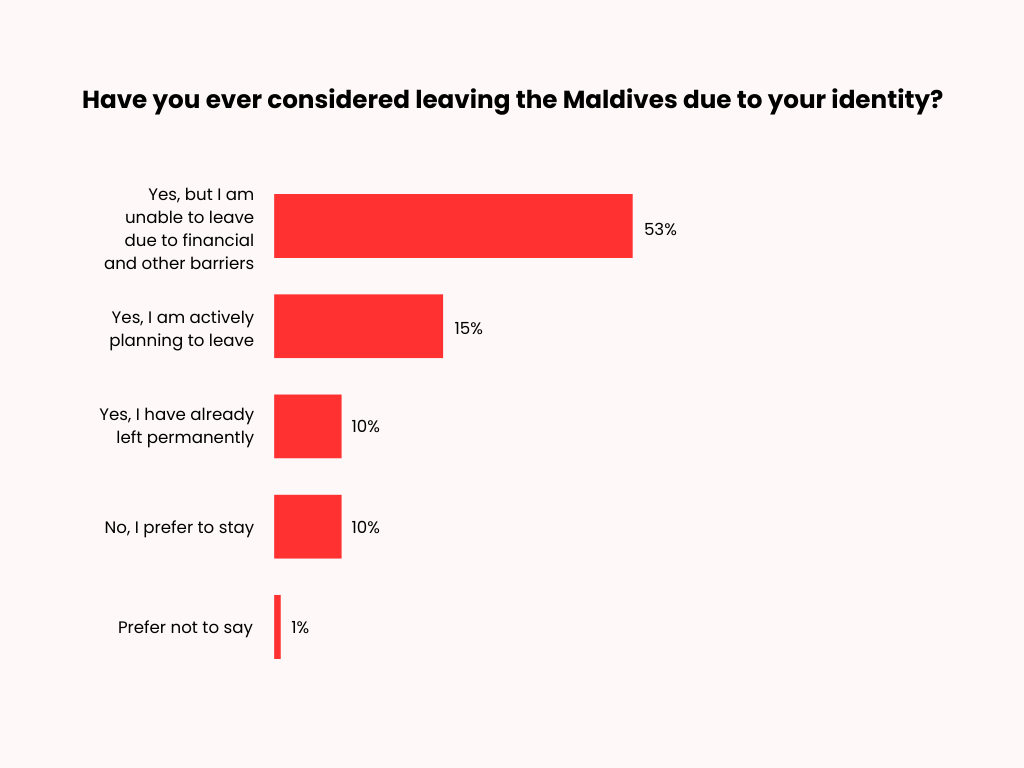 Most respondents have considered leaving the Maldives due to their identity (88%). However, half of respondents (50%) report being unable to leave due to financial and other barriers. A smaller proportion are actively planning to leave (24%), while others have already left permanently (10%). One percent of respondents preferred to not say.