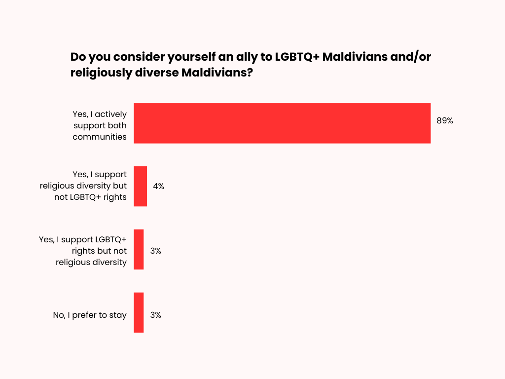 A clear majority of respondents also identify as allies to LGBTQ+ and/or religiously diverse Maldivians and report actively supporting both communities (89%). A small proportion of respondents support religious diversity but not LGBTQ+ rights (4%), or support LGBTQ+ rights but not religious diversity (3%). A further 3% of respondents preferred not to disclose their views.