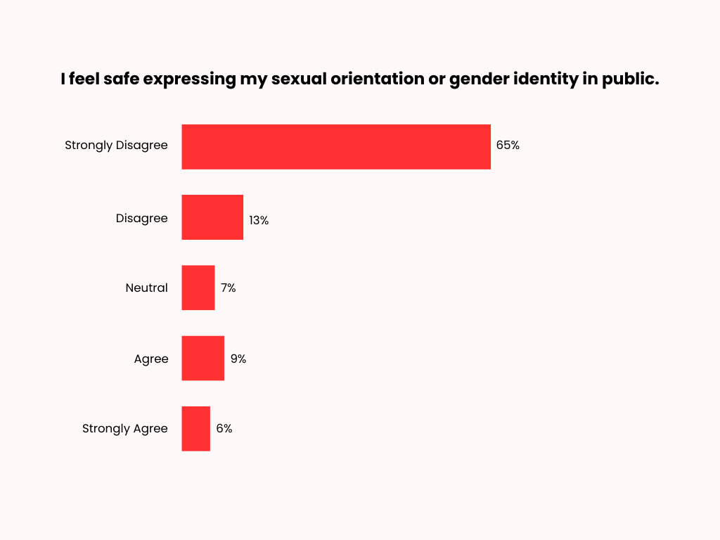 The majority of respondents report extremely low feelings of safety when expressing their gender identity or sexual orientation in public. Sixty-five percent strongly disagree with the statement that they feel safe expressing their sexual orientation or gender identity in public, while 13% disagree and 7% remain neutral. In contrast, only 9% agree with the statement, and 6% strongly agree.