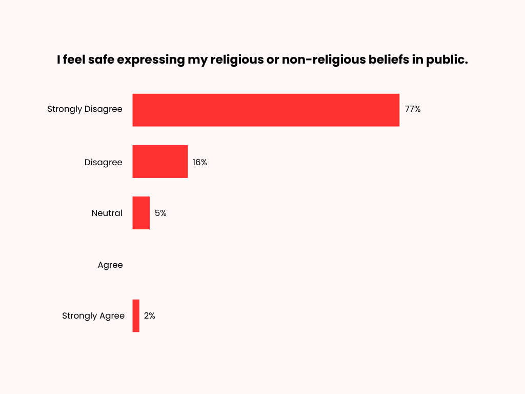 Similarly, 77% of respondents strongly disagree with the statement that they feel safe expressing their religious or non-religious beliefs in public. Sixteen percent disagree, 5% remain neutral, and only 2% strongly agree.