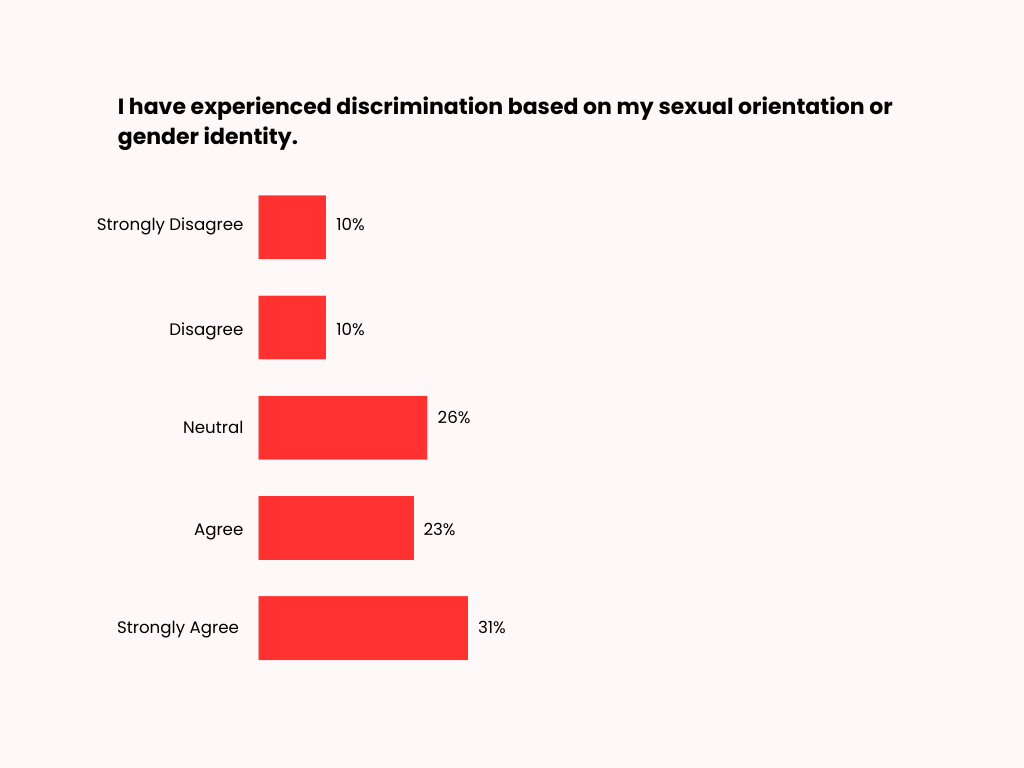 Thirty-one percent of respondents strongly agree that they have experienced discrimination based on their sexual orientation or gender identity, and 23% agree. Twenty-six percent remain neutral, while 10% either disagree or strongly disagree.