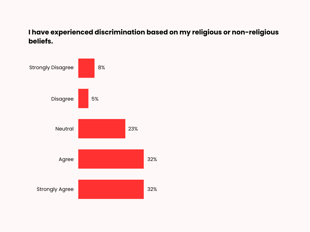 Thirty-two percent of respondents strongly agree that they have experienced discrimination based on their religious or non-religious beliefs, with a further 32% agreeing. Twenty-three percent remain neutral, while 5% disagree and 8% strongly disagree.