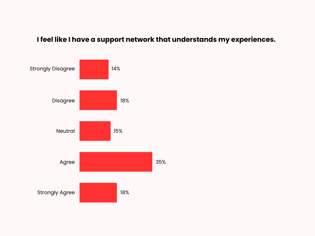 Fourteen percent of respondents strongly disagree that they have a support network that understands their experiences, while 18% disagree. Fifteen percent remain neutral, whereas 35% agree and 18% strongly agree.