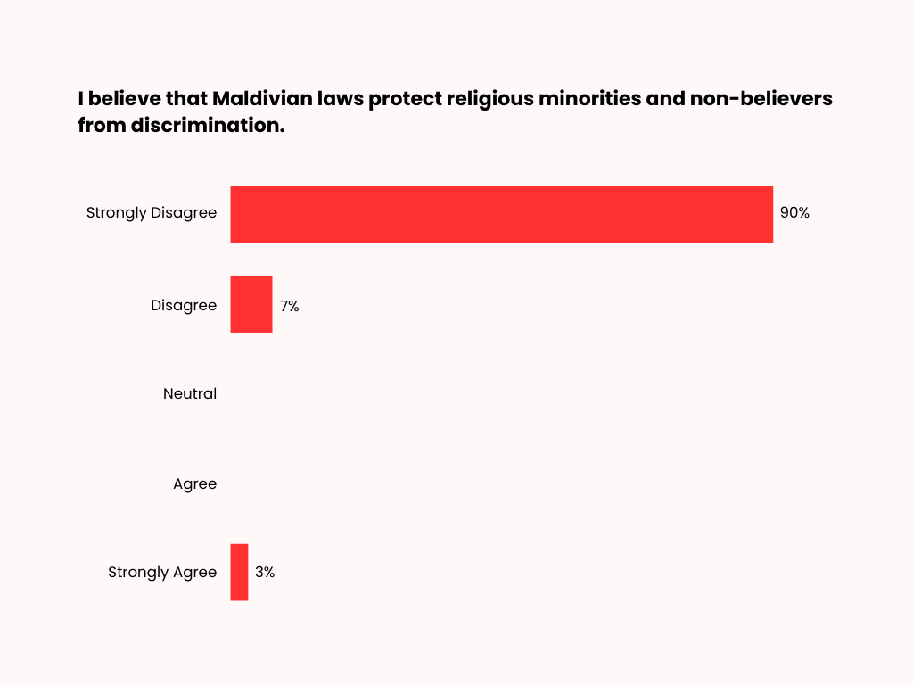 Similarly, 90% of respondents strongly disagree and 7% disagree that Maldivian laws protect religious minorities and non-believers from discrimination. Only a small proportion strongly agree with this statement (3%).