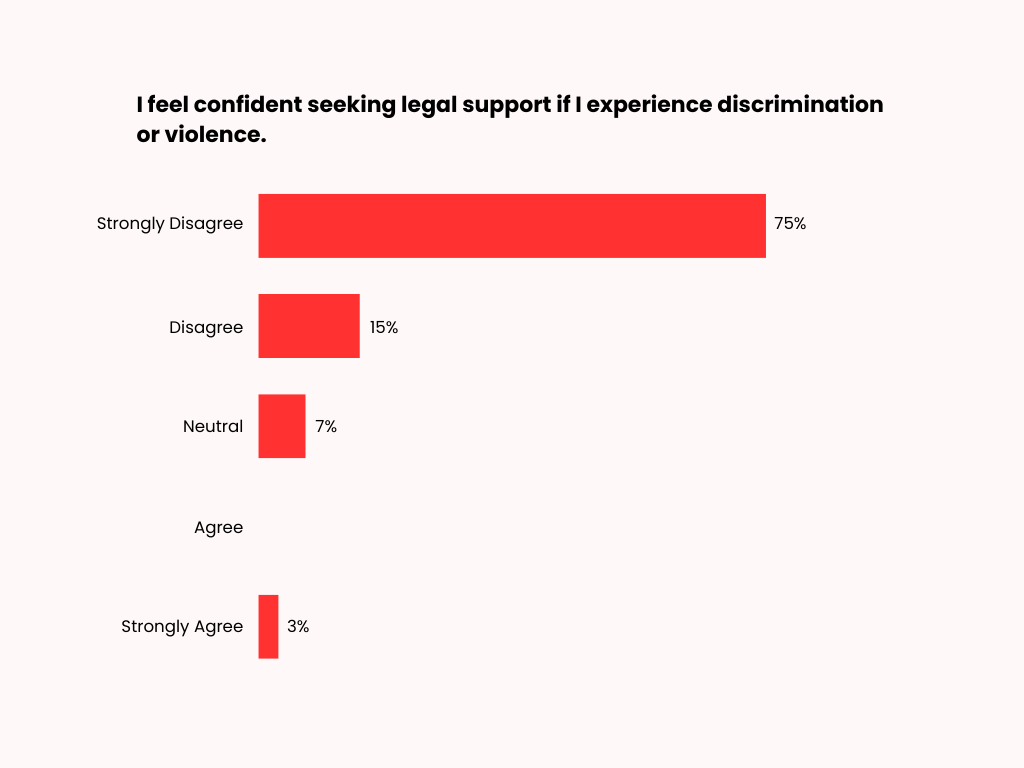 Most respondents strongly disagree (75%) or disagree (15%) that they feel confident seeking legal support if they experience discrimination or violence. Seven percent remain neutral, while only 3% strongly agree.