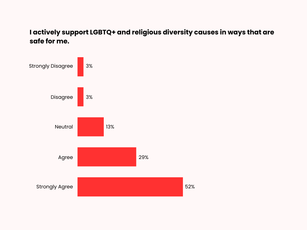 Respondents actively support LGBTQ+ and religious diversity causes in ways that are safe and anonymous. Fifty-two percent strongly agree that they do so, while 29% agree. Thirteen percent remain neutral, and only a small proportion disagree (3%) or strongly disagree (3%) with this statement.