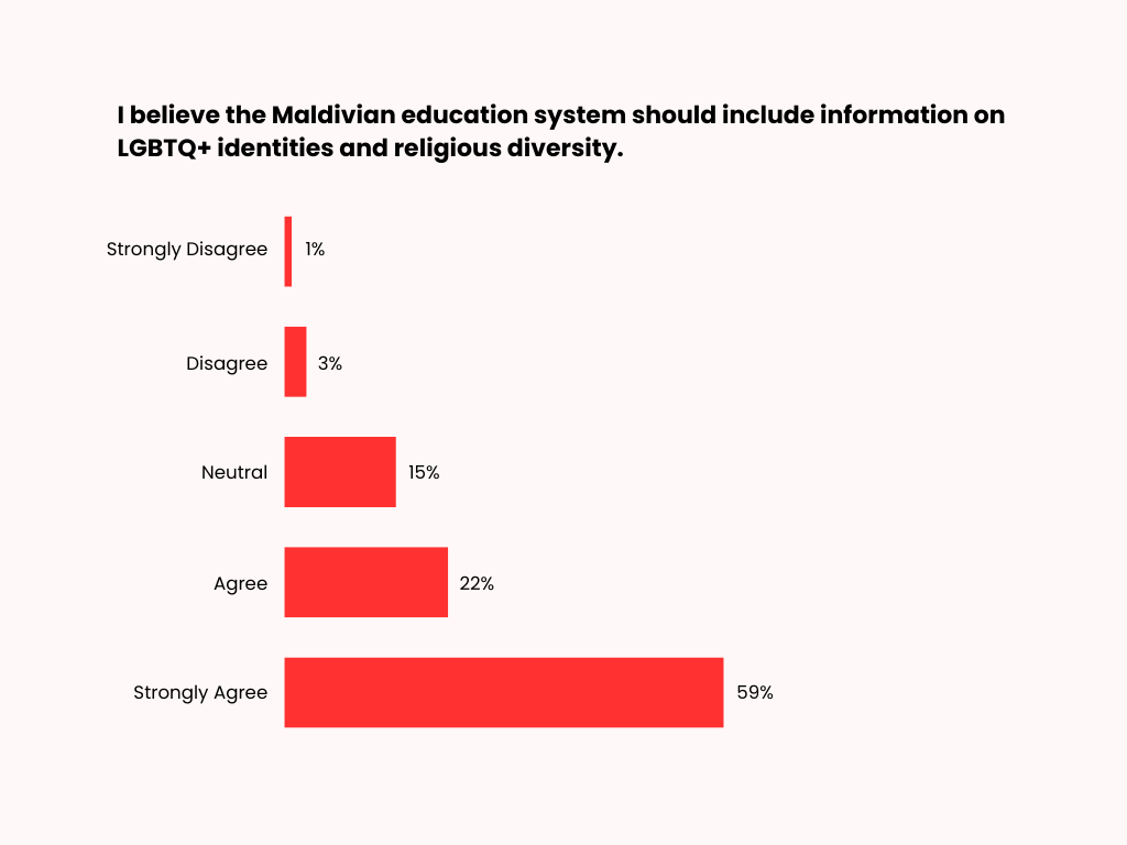 Most respondents support the inclusion of information on LGBTQ+ identities and religious diversity in the Maldivian education system. Fifty-nine percent strongly agree and 22% agree that such content should be included, while 15% remain neutral. Only a small proportion of respondents disagree (3%) or strongly disagree (1%).