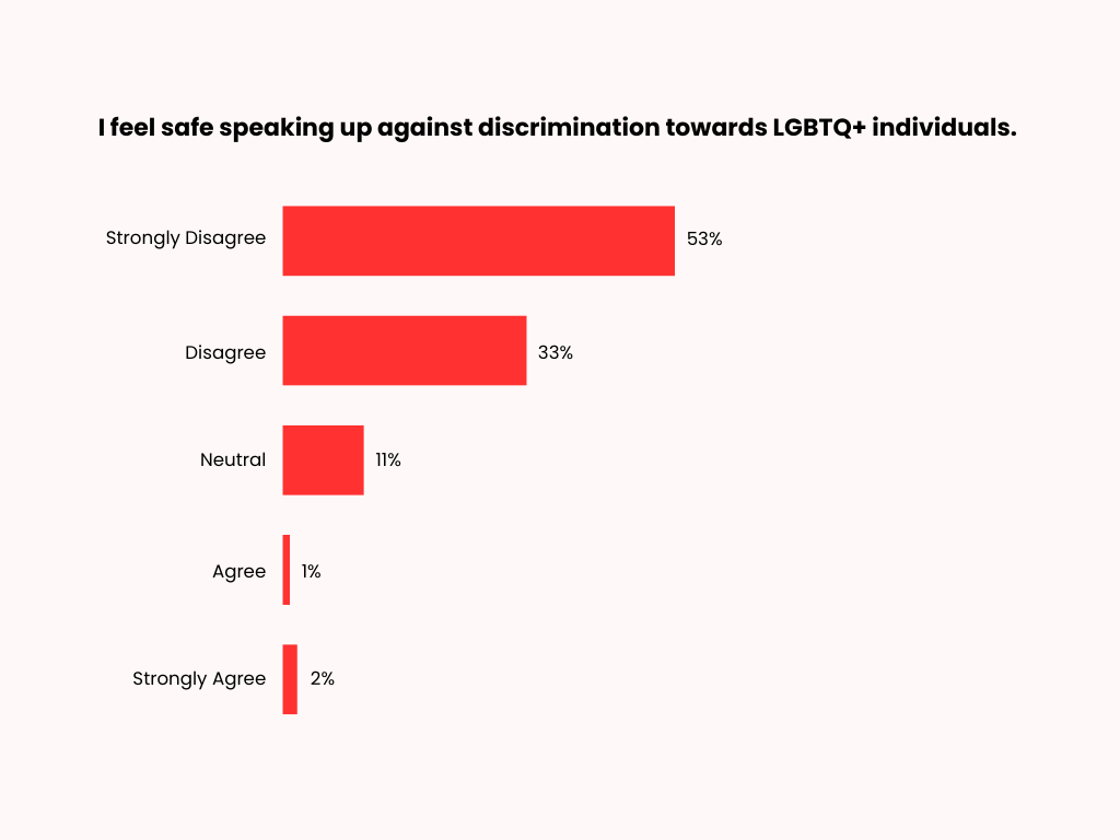 Overwhelmingly, respondents strongly disagree (53%) or disagree (33%) that they feel safe speaking up against discrimination toward LGBTQ+ individuals. Ten percent report neutral views, while only a small proportion agree (1%) or strongly agree (2%).