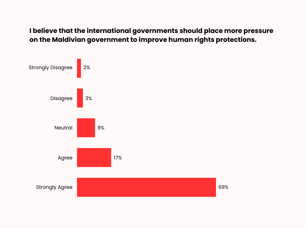 Most respondents either strongly agree (69%) or agree (17%) that international governments should place greater pressure on the Maldivian government to improve human rights protections. A smaller proportion of respondents report neutral views (9%), while few disagree (3%) or strongly disagree (2%).