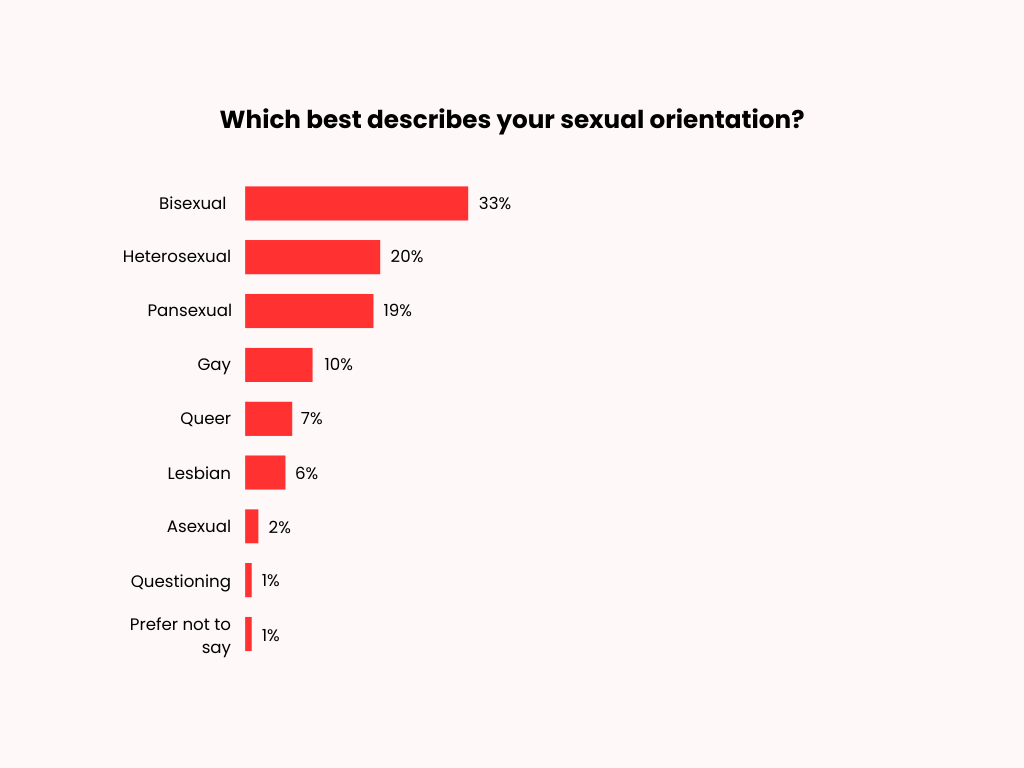 Most identify as bisexual (33%) followed by heterosexual (20%), pansexual (19%), gay (10%), queer (7%), lesbian (6%), asexual (2%) and questioning (1%).