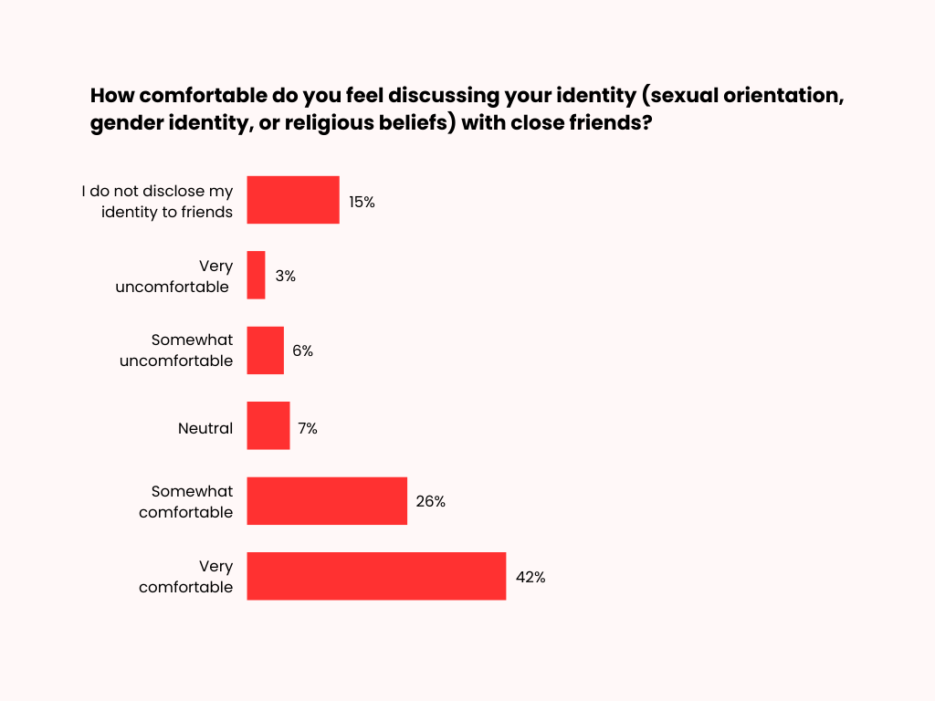 The majority of respondents feel comfortable discussing their identity (sexual orientation, gender identity, or religious beliefs) with close friends (42%), while 26% feel somewhat comfortable. Some respondents report not disclosing their identity to friends (15%). A few feel neutral (7%), somewhat uncomfortable (6%), or very uncomfortable (3%).