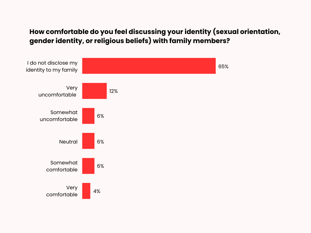 The majority of respondents have not disclosed their identity to their family members (65%). Some feel very uncomfortable (12%) or somewhat uncomfortable (6%) revealing their identity, while a smaller proportion feel somewhat comfortable (6%) or very comfortable (4%). An additional 6% remain neutral regarding disclosure to family members.