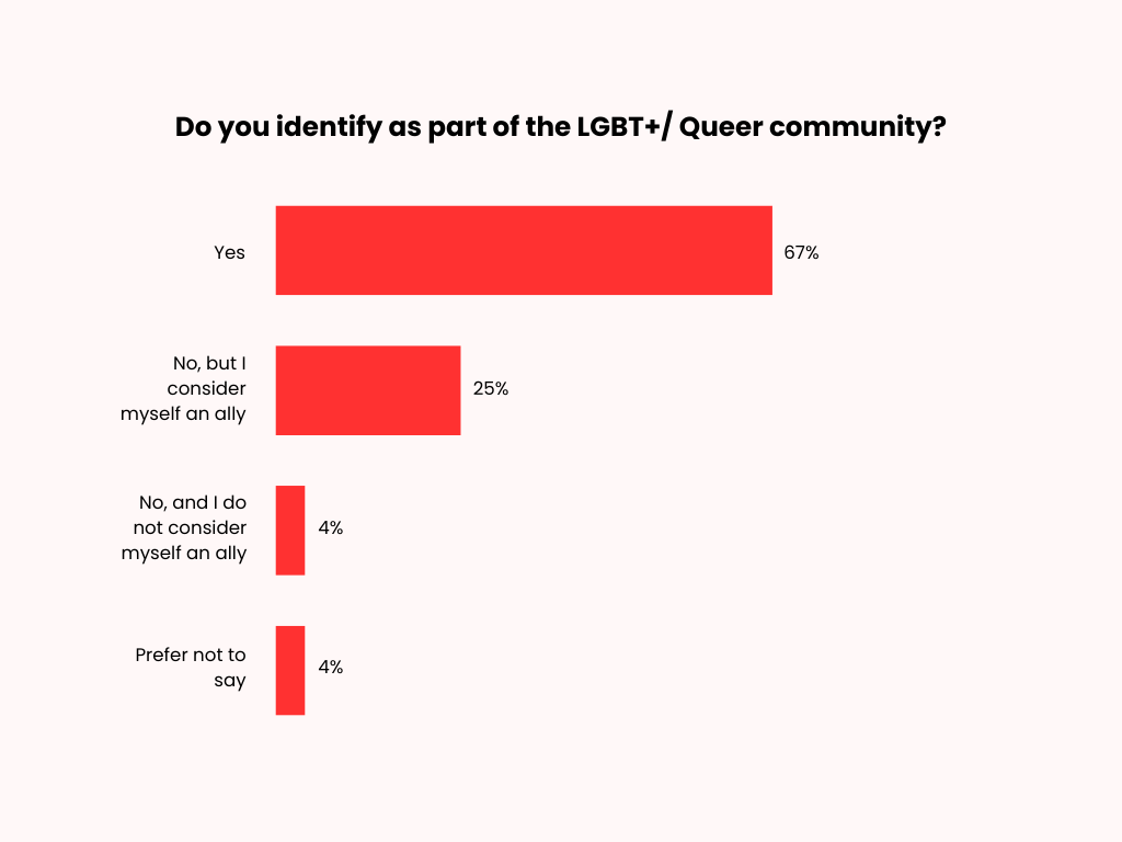 A substantial proportion of respondents identify as part of the LGBTQ+ community (67%), while many identify as allies (25%). Only 4 percent not consider themselves an ally while 4% prefer not to disclose whether they identify as part of the LGBTQ+ community.