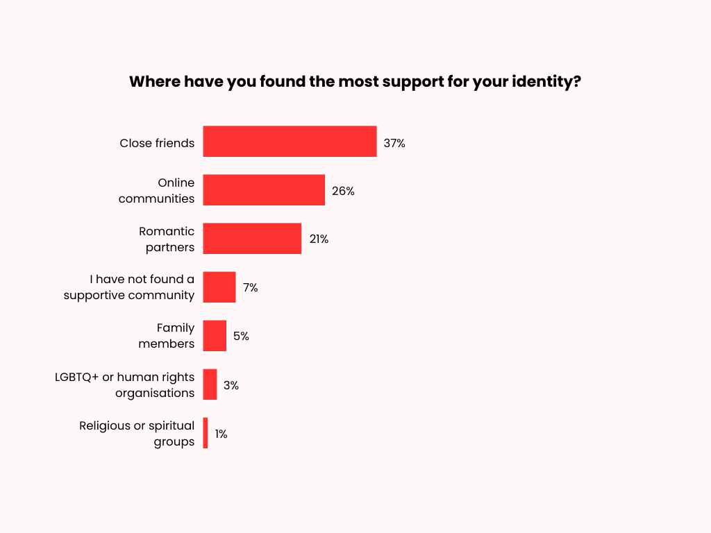 While most respondents report finding the most support for their identity from close friends (37%), a substantial number have found support in online communities (26%) or from romantic partners (21%). Some respondents have not found a community supportive of their identity (7%), and smaller proportions report receiving support from family members (5%), LGBTQIA+ or human rights organisations (3%), and religious or spiritual groups (1%).