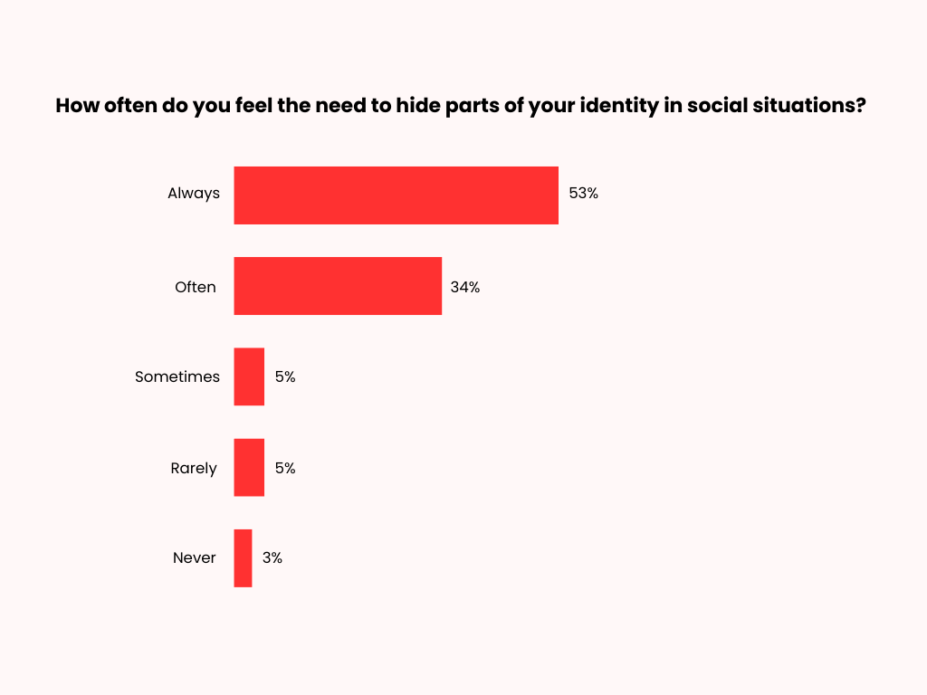 Most respondents reported having to always (53%) or often (34%) hide parts of their identity in social situations. In contrast, only a small proportion indicated that they sometimes (5%), rarely (5%), or never (3%) had to conceal aspects of their identity in social situations.