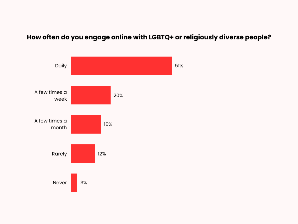 The majority of respondents engage with LGBTQ+ and religiously diverse people online daily (51%), while others do so a few times a week (20%), a few times a month (15%), or rarely (12%). Only a small proportion report ever engaging with LGBTQ+ or religiously diverse people online (3%).
