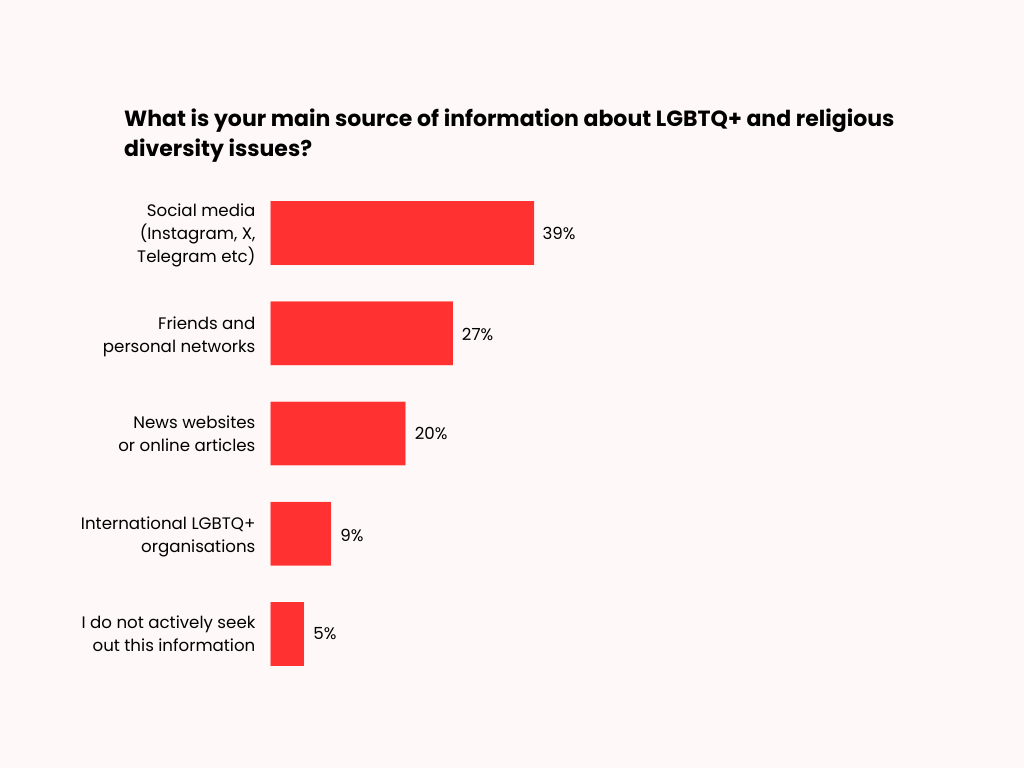 For many respondents, the main sources of information about LGBTQ+ and religious diversity issues are social media (39%), friends and personal networks (27%), and news websites or online articles (20%). Only a small proportion rely on international LGBTQ+ organisations as their primary source of information (9%), while a minority do not actively seek out this information (5%).