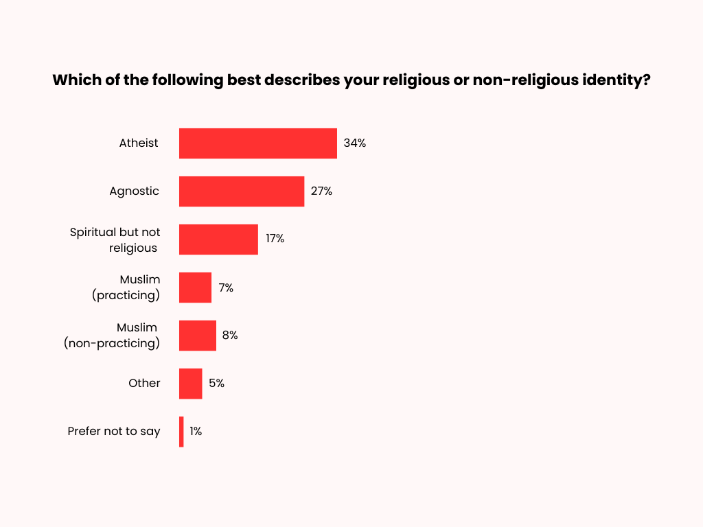 Non-religious beliefs are prevalent among respondents, with the majority identifying as atheist (34%), agnostic (27%), or spiritual but not religious (17%). A smaller proportion of respondents identify as Muslim (15%), including those who are non-practising (8%) and practising (7%).