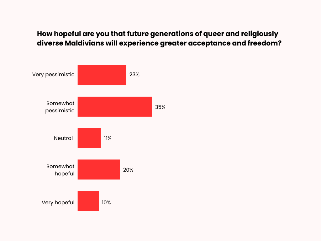 The majority of respondents feel somewhat pessimistic (35%) or very pessimistic (23%) about a future in which queer and religiously diverse Maldivians enjoy greater acceptance and freedom. Some respondents feel somewhat hopeful (20%) or very hopeful (10%), while 11% report neutral views regarding this statement.